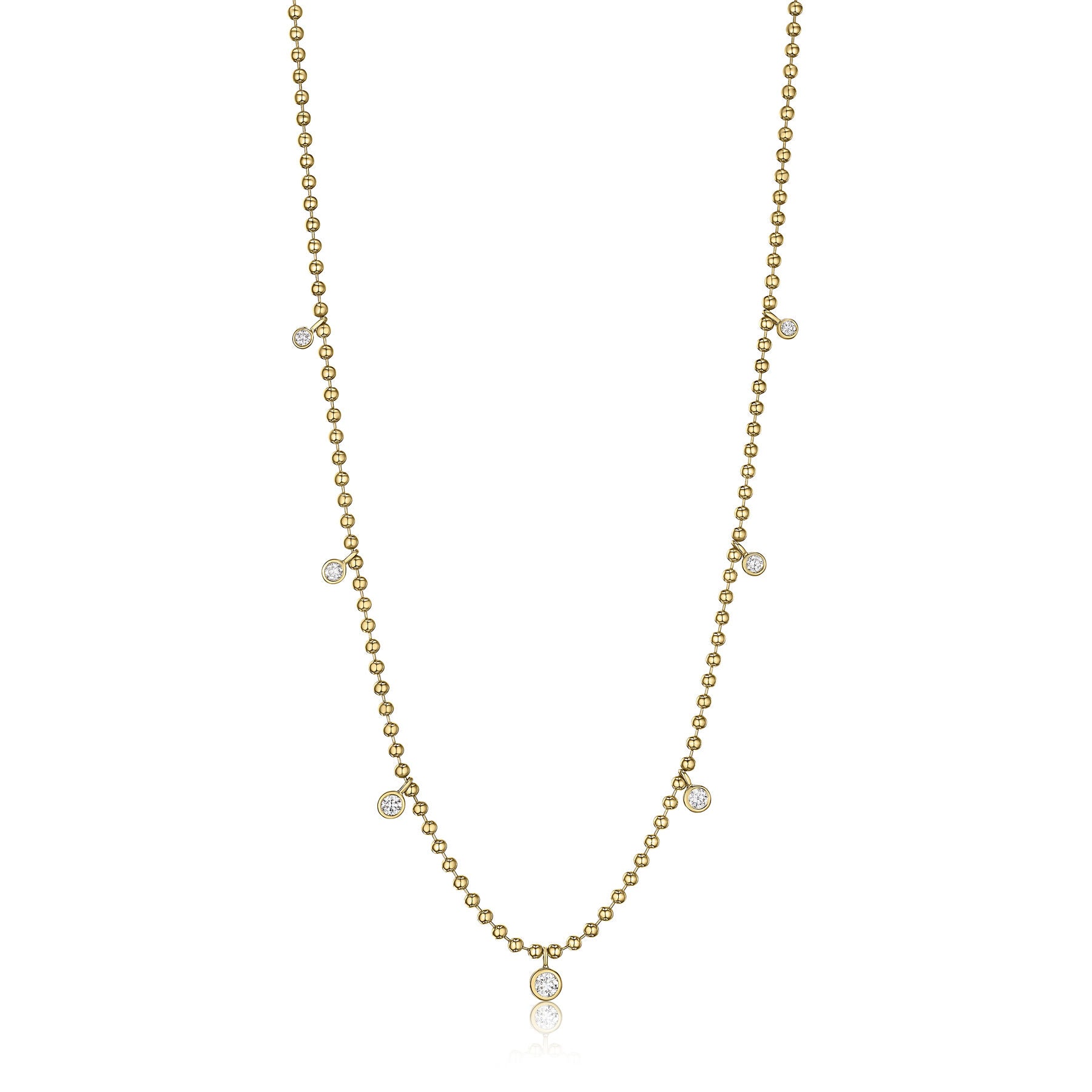 Elevate your everyday style with this incredible yellow gold chain necklace. Featuring a diamond cut beaded chain design and punctuated with exquisitely bezel set, round brilliant cut diamonds, this piece offers a subtle sparkle. Its classic composition ensures versatility, making it perfect for solo wear or layered styling.