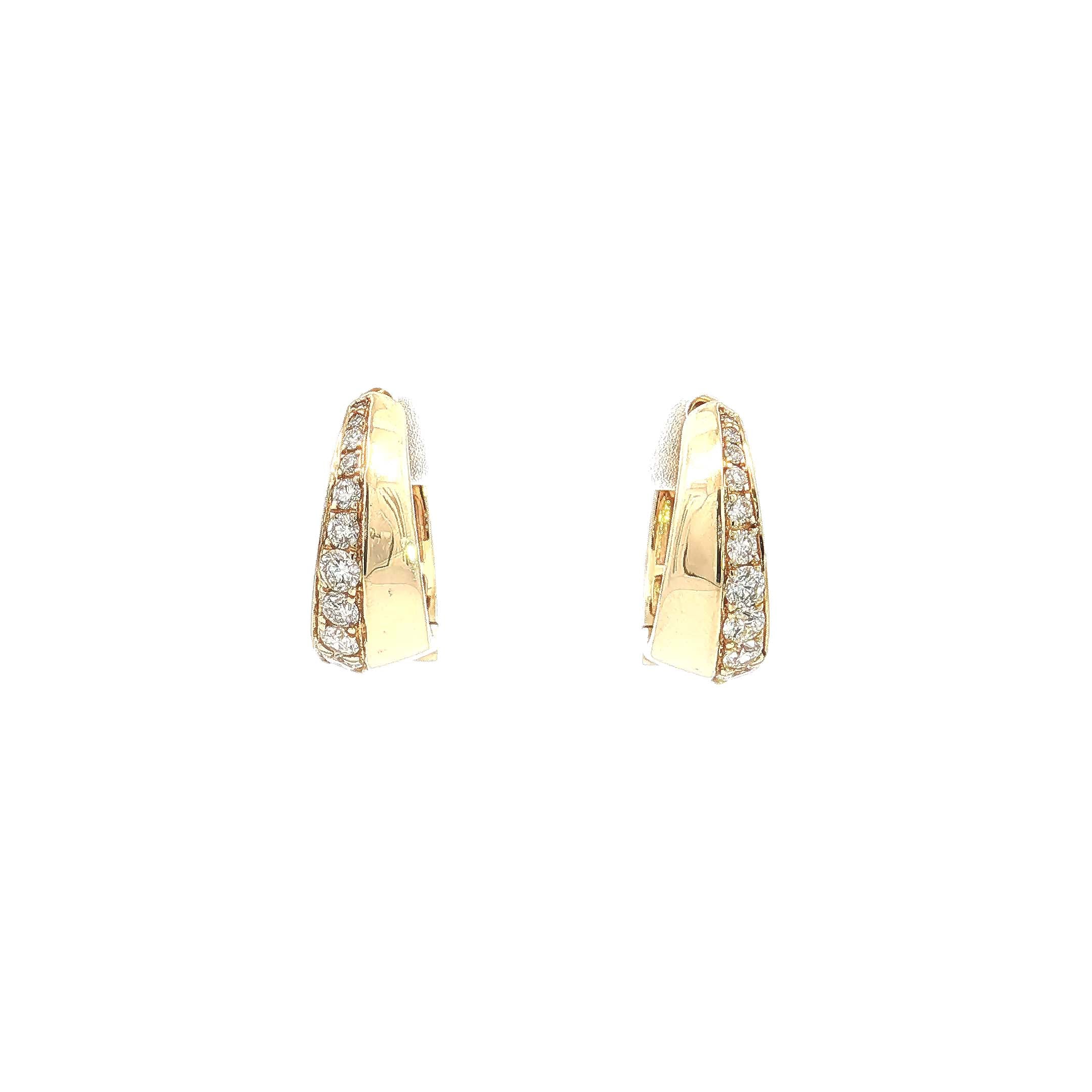 Elevate your everyday look with these stunning yellow gold hoop earrings. Each earring is meticulously set with round brilliant cut diamonds, offering exceptional sparkle. The earrings' design features a classic silhouette, perfect for adding a touch of sophisticated glamour to any outfit. These hoops are a versatile addition to your jewelry collection.