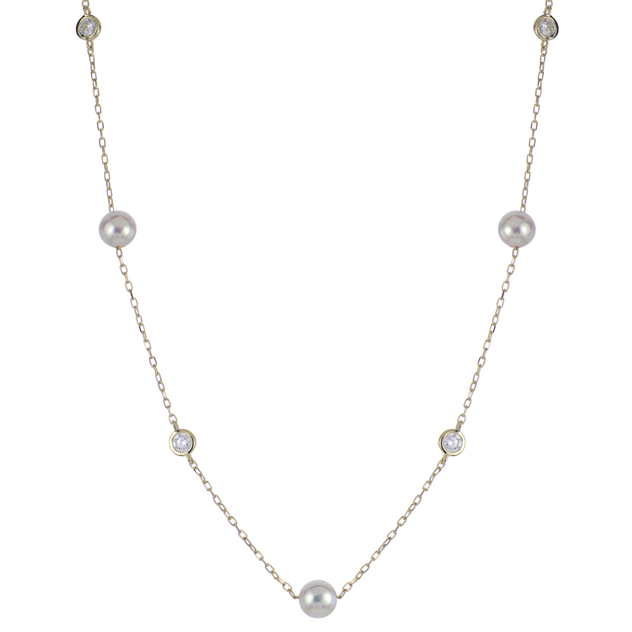 14K Yellow Gold High Luster Akoya Pearl & Lab Grown Diamond 18" Station Necklace