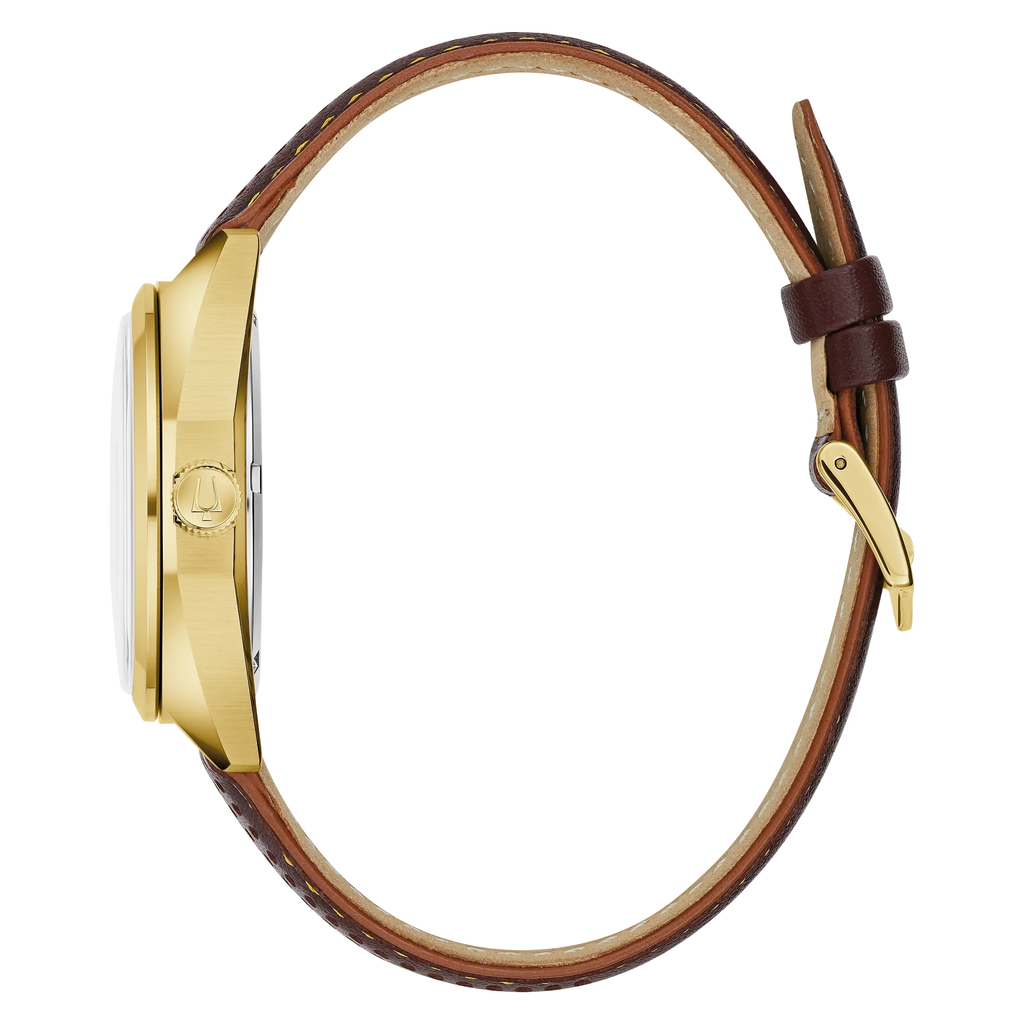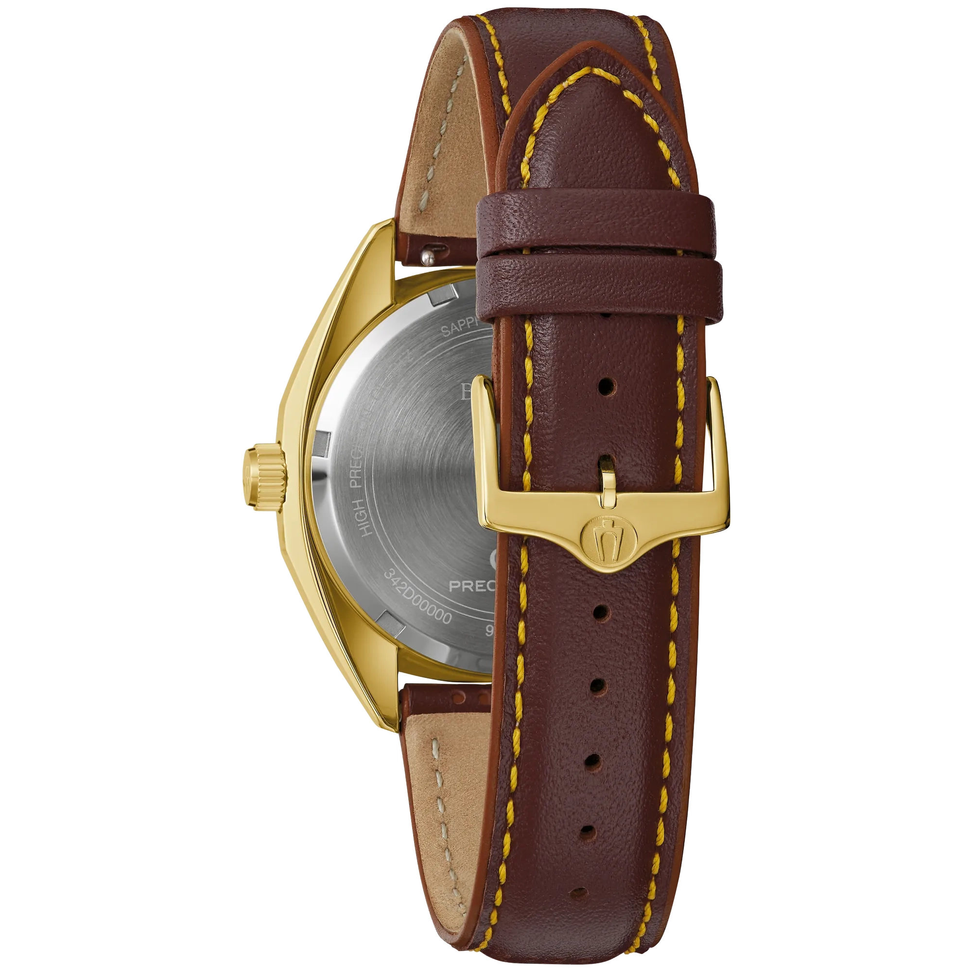 traight from the 1970s comes the Bulova 1973 Jet Star, an iconic model from the brands impressive history, now equipped with an equally impressive movement. Borrowing from its historic forebear, the gold-tone stainless steel case features a striking angular design with broad facets and a domed sapphire crystal. The warmth of the butterscotch sunburst dial is accented by a rich brown chapter ring, applied brown and gold-tone hour markers, and gold tone hands. Luminescent plots at each hour and fill in the hands allow for exceptional legibility in every environment, while a date display sits perfectly at 3 o’clock. A red seconds hand brings a pop of color and sweeps smoothly around the dial thanks to Bulova’s Precisionist movement, a revolutionary 8-jewel quartz mechanism vibrating at a remarkable 262kHz and accurate to 5 seconds per month with increased resistance to temperature changes. The Bulova 1973 ‘F’ Jet Star is paired perfectly with a brown leather strap with latched spring bars for easy release. Strut your stuff in legendary style with the high-flying Bulova 1973 Jet Star, a legendary design recreated for the modern connoisseur.