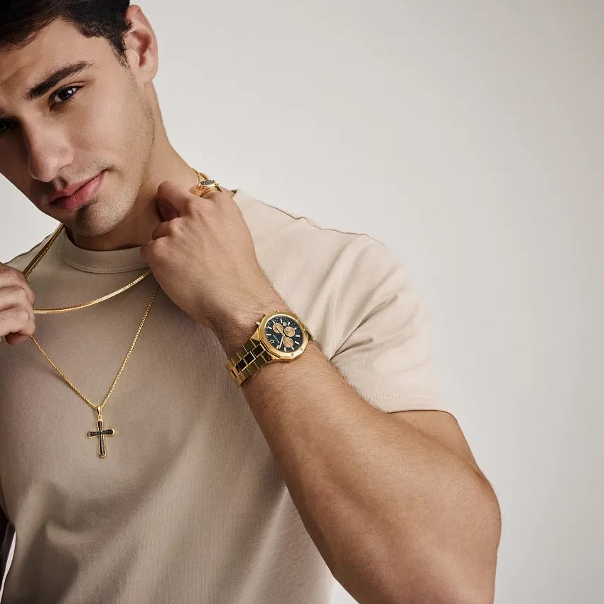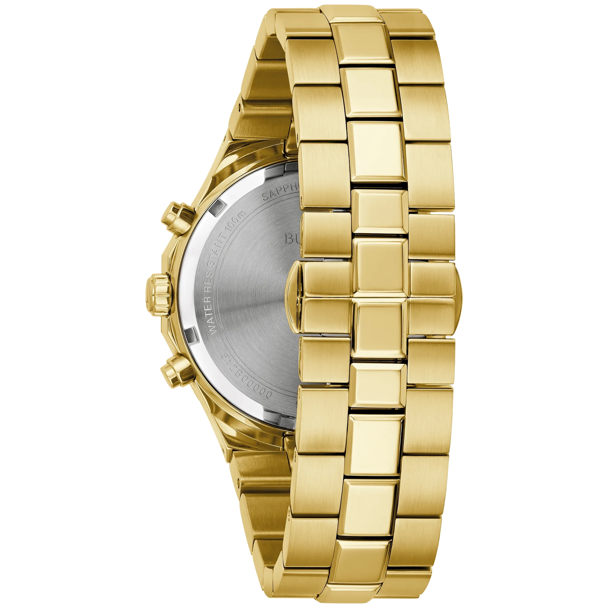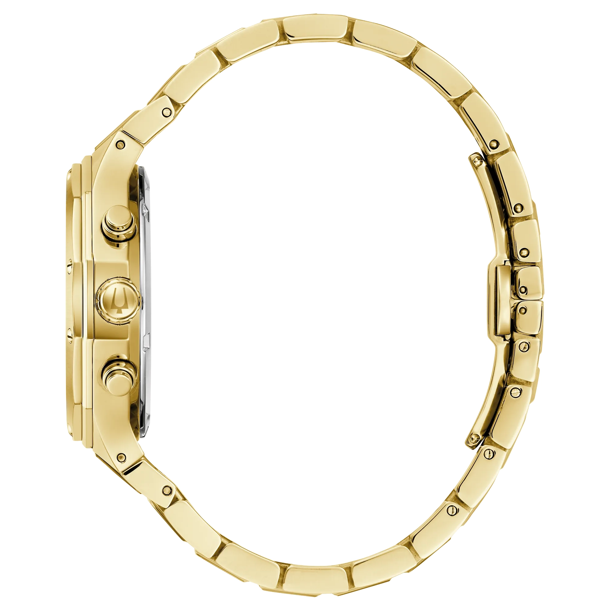 Bold, modern design characterizes this 6-hand chronograph from the Classic Bulova Prestige men’s collection. The watch features a faceted 40mm gold-tone stainless steel case with a geometric bezel, flat sapphire crystal with anti-reflective coating, 100m of water resistance, and a chamfered 3-link bracelet with a combination of brushed and polished finishes and a push-button deployant closure. The black textured dial with elegant striping has gold-tone hands and applied markers with Super-LumiNova luminescent fill, a date display, and gold-tone sub-dials including a 24-hour display. Highly functional with a distinctive design, this timepiece is suited for any occasion, from the everyday to the extraordinary.