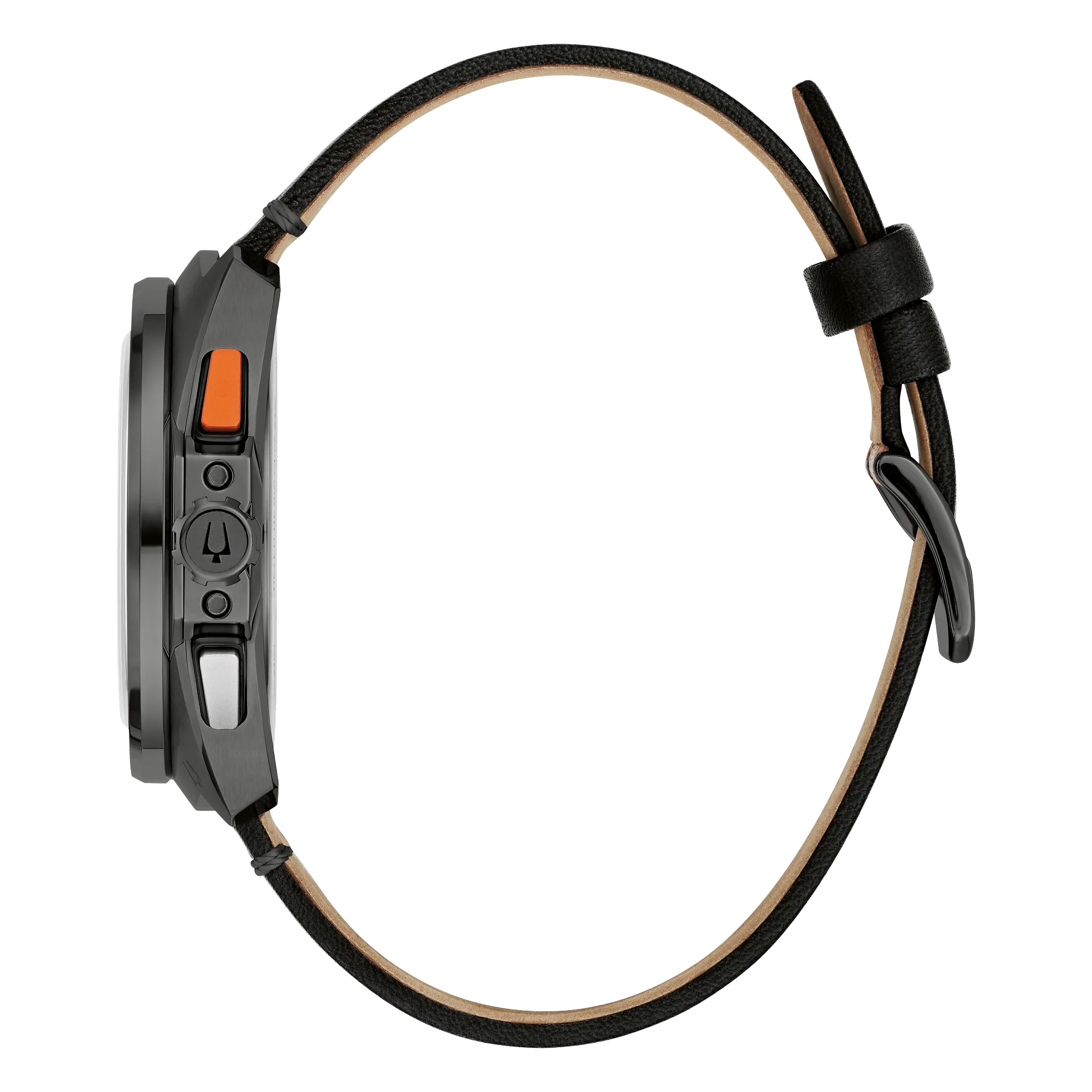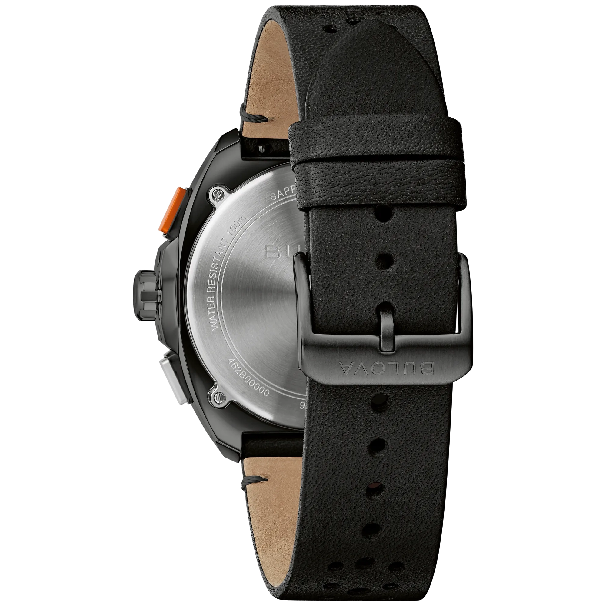 Built on Bulova’s vibrant history in motorsport – from soap box derbies to the upper echelons of auto racing – the new men’s Racer chronograph watch is fine-tuned and designed for performance. The contoured black IP stainless steel case features a unique design evoking the aerodynamic curves of the world’s fastest automobiles. A two-tone orange and black tachymeter ring offers further functionality, while pronounced pushers provide a distinctively automotive aesthetic. The black 5-hand chronograph dial features an orange and white racing pattern chapter ring, with a date display at 6 o’clock and black subdials displaying the chronograph minutes and the 24-hour time. A bold orange chronograph seconds hand ensures optimal legibility no matter the speed. The dial is appointed with applied silver-tone markers and matching beveled hands, all filled with a super-luminous material for low-light visibility. The watch is paired with a perforated black leather racing-style strap with a pin buckle closure. Whether gripping the wheel around the bend at the track or on your daily commute, the Bulova men’s Racer chronograph is a stylish expression of racing history and a passion for speed.