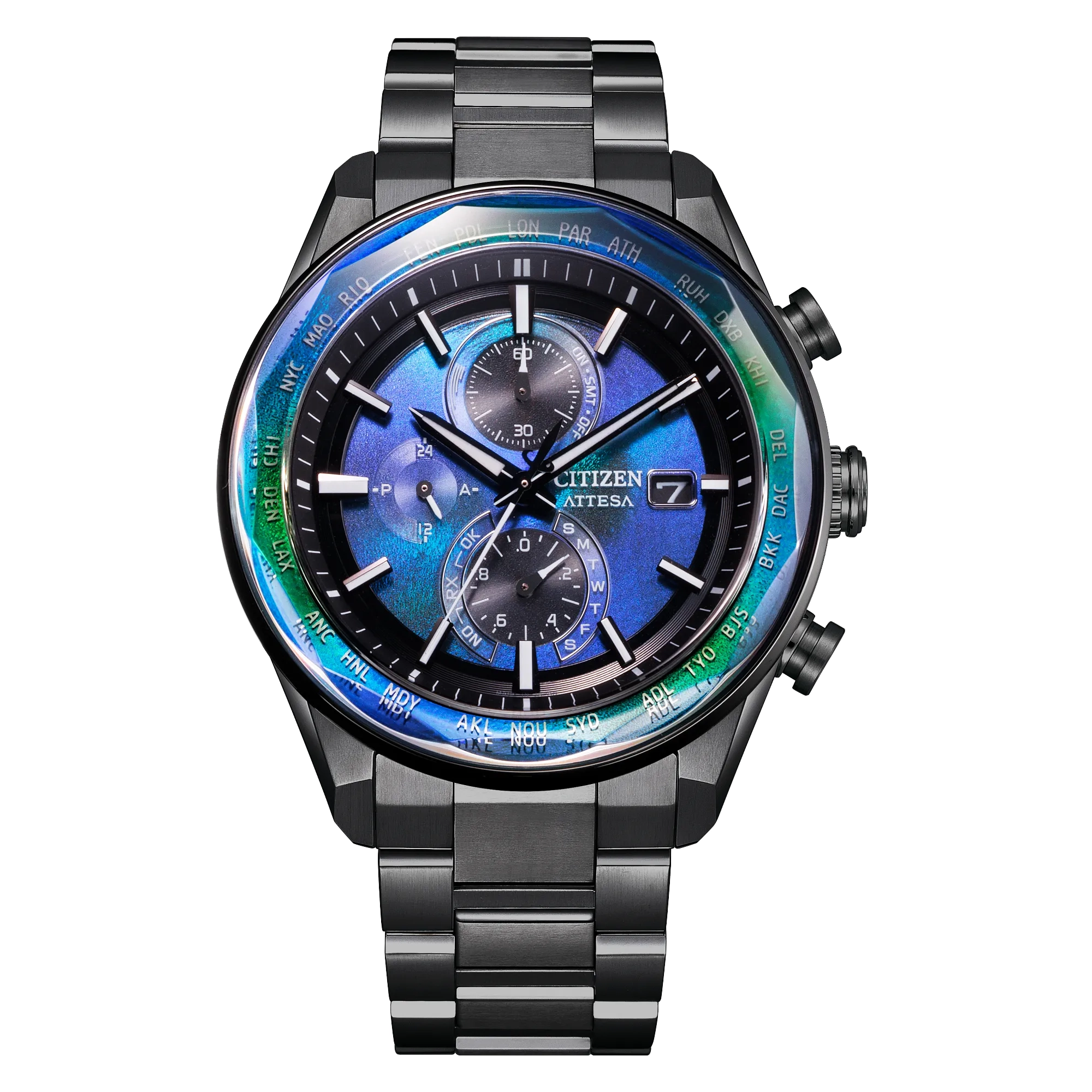 The view of the Earth from outer space inspired the blue and green colorway of the dial. Upon it, a vertical three-register chronograph is at work, with applied details adding dimensionality alongside the utility of a 3 o'clock date display. Other advanced features include world time in 26 time zones, a perpetual calendar with day and date indicators, 12/24-hour timekeeping, and a power reserve display. Featuring Eco-Drive light-powered Atomic Timekeeping functionality, the radio-controlled timepiece self-adjusts its time or calendar when traveling overseas by receiving local time signals in four different regions. Water resistant up to 100 meters.