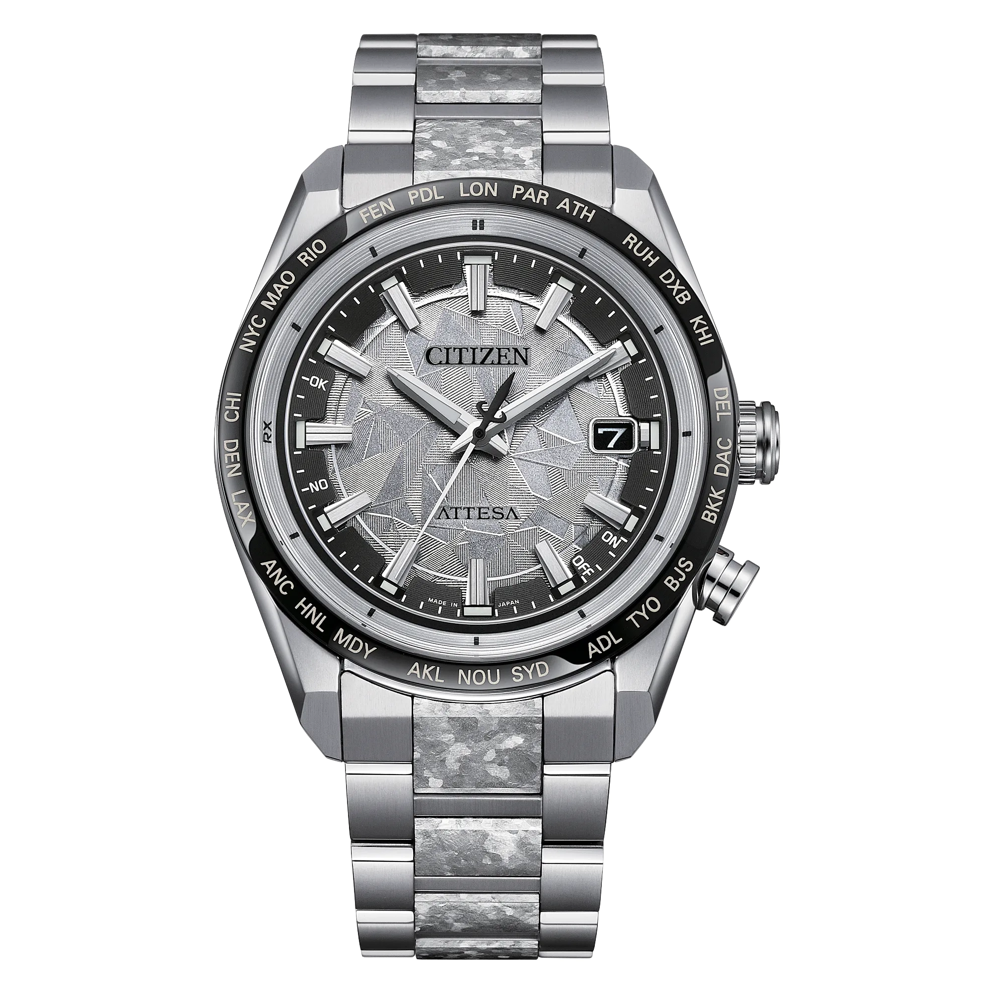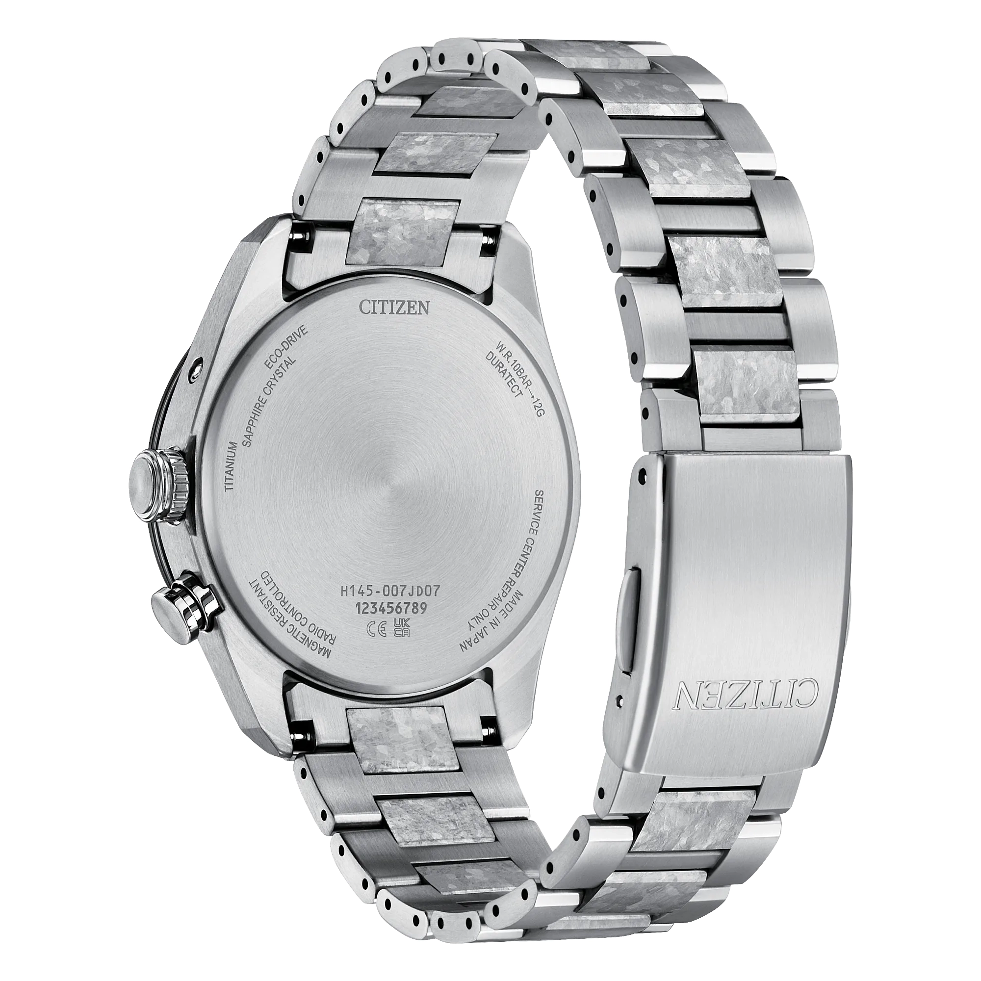 On the special detailed dial, a captivating time-and-date display is at work, with black and applied DLC accents adding dimension. Advanced features of the timepiece include world time in 26 time zones and a perpetual calendar. Featuring our sustainably light-powered Eco-Drive Atomic Timekeeping functionality, the timepiece self-adjusts to time or calendar when traveling overseas by receiving local time signals in four different regions. Water resistant up to 100 meters. Caliber H145.